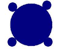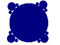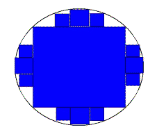 | Można by też z kółek ułożyć dokładnie kwadrat, ale trzeba użyć do tego nieskończonej ilości coraz mniejszych kółek wpasowywanych w puste miejsca między już umieszczonymi. Rozmycie promieni byłoby bardzo duże, bo można w tej figurze dopatrzyć się ogromnej ilości okrągłych plamek farby. W zależności od tego jak ktoś je pomierzy, uzyskamy różne wyniki na promień. | ![]() figura 4 |