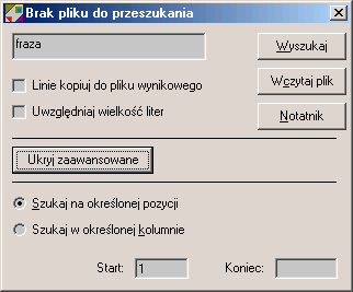 | ew. kopiuje wszystkie te linie do nowego pliku umieszczonego w tym samym katalogu co plik źródłowy (w aktualnej wersji 1,5 program umożliwia kopiowanie również linii nie zawierających wyspecyfikowanej frazy) |