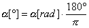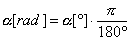 Lub wyrażając kąt poprzez zmienną alfa i zapisując na poziomej kresce ułamkowej: Stopnie na radiany